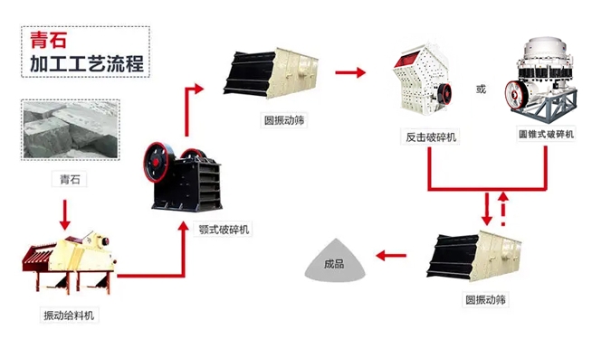 將大塊青石物料經(jīng)料倉由振動給料機均勻地送進顎式破碎機進行粗碎,粗碎后的青石由膠帶輸送機送入反擊式破碎機進行中碎。
